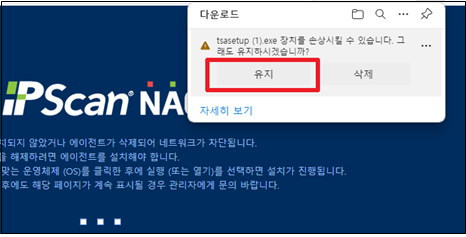 기타 메인으로 이동 기타 학교소개 입학안내 대학 대학원 학사안내 대학생활 동아광장 1차-개교80주년- 닫기 기타 기타 Agent 미설치 단말 SNS 목록열기 FACEBOOK 공유하기 TWITTER 공유하기 BLOG 공유하기 KAKAO STORY 공유하기 SNS 목록닫기 인쇄 url 복사 NAC 에이전트 미설치 단말1웹 브라우저 사용 시 아래 페이지로 이동되며 Agent Setup 파일을 다운로드2다운로드 중 아래와 같은 경고가 발생할 수 있으나 ‘계속’ 혹은 ‘유지’ 선택3다운로드 된 파일을 설치할 때 아래와 같은 메시지는 ‘실행’ 선택4설치할 때 아래와 같은 메시지는 ‘예’ 선택